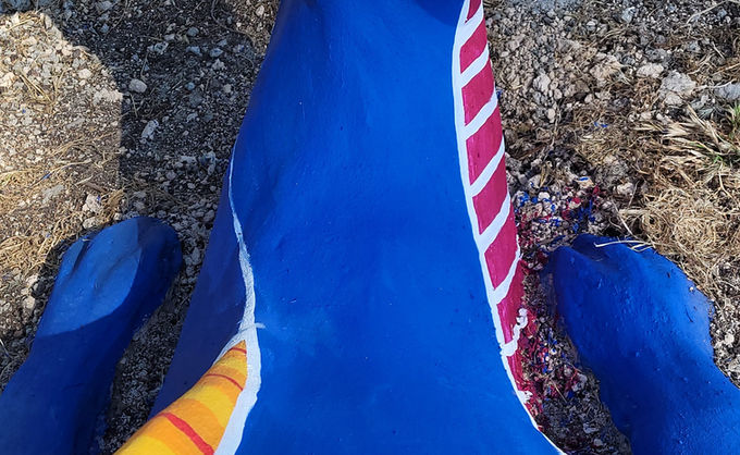 שלישיית דרקונים חמודה שנבנתה יחד עם ילדי בית הספר אשר גם הכינו מפסיפס את העיגולים שמעטרים את הדרקונים